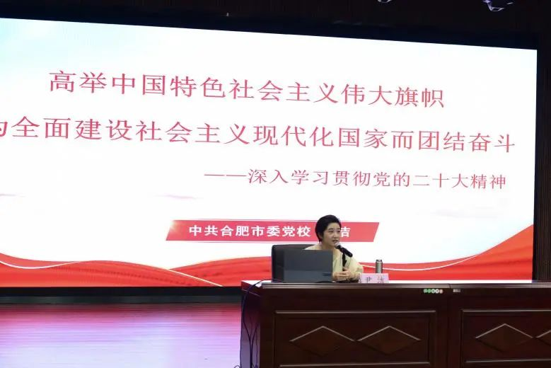 为深入学习宣传贯彻党的二十大精神,推动党的二十大精神入脑入心、走深走实,激励全体教师在学思践悟、深学笃行中凝聚奋进力量,7月3日下午,合肥市六安路小学举办党的二十大精神培训专题讲座,邀请合肥市委党校党史党建教研部副教授、副主任尹洁作题为《高举中国特色社会主义伟大旗帜 为全面建设社会主义现代化国家而团结奋斗——深入学习贯彻党的二十大精神》的专题讲座。本场培训由办公室主任阮奇亮主持。
