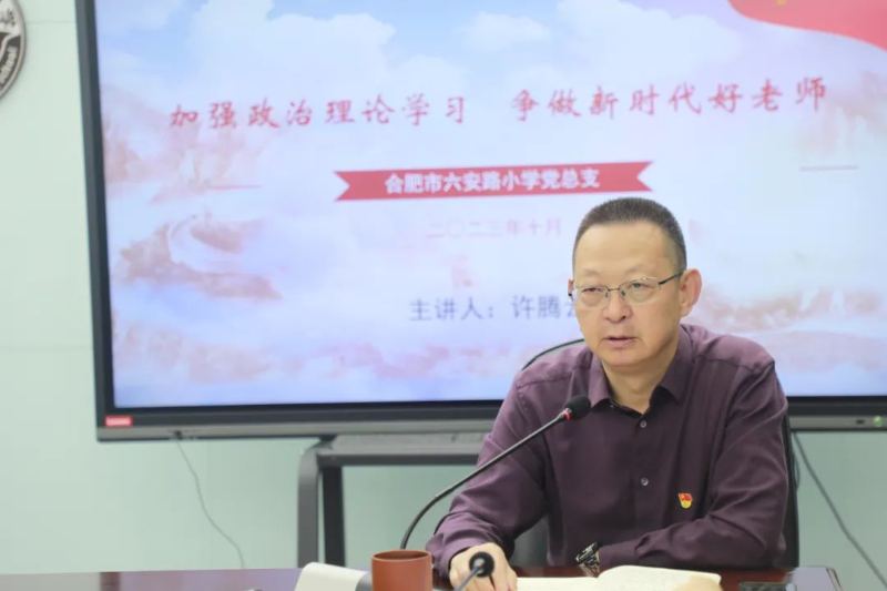 为深入学习贯彻习近平新时代中国特色社会主义思想,牢牢把握“学思想、强党性、重实践、建新功”总要求,中共合肥市六安路小学总支部委员会于10月18日下午组织开展了专题党课活动。活动由合肥市六安路小学教育集团党总支副书记、校长朱清萍主持,党总支书记许腾云及全体党员参加本次活动。