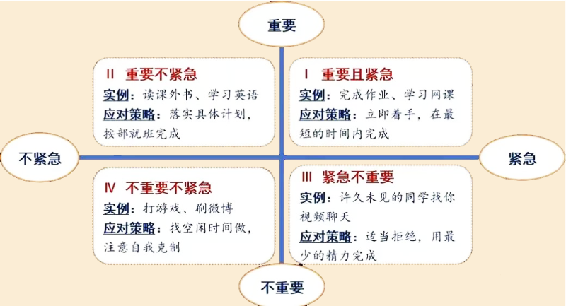 优先处理第一象限里紧急又重要的事情,比如今天晚些时候约好跟朋友去打球。不被第三象限里紧急但不重要的事情分心,比如写着作业特别想去看看动画片的更新等。第二象限里重要但不紧急的事情要未雨绸缪、有规律实施执行,比如后天要去外地旅游。第四象限里不重要也不紧急的事情,可不参与的尽量不参与,节省我们宝贵的时间和认知资源。