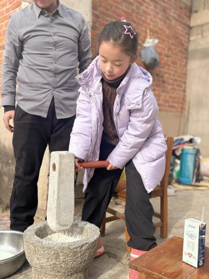 现在的我也开心地当起了小帮手,把提前泡好的糯米倒入石臼里,学着爸爸的样子拿起石杵。可是太重了,我只能很吃力地磕了两下。然后,我又拿起了小筛子,筛起了糯米粉,很快就像白雪一样铺在了大红盆里,最后晒干收好。