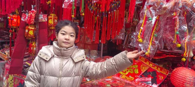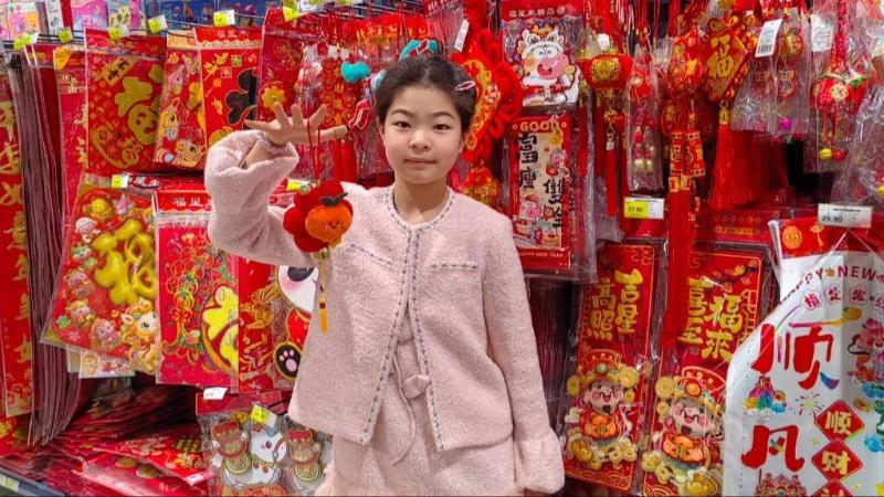 这个春节,我和妹妹的“年”味游,从走进超市年货街的瞬间,我们就被扑面而来的红色裹挟了。头顶上,一串串红灯笼和中国结随风轻晃;货架上,春联、福字、生肖玩偶挤得满满当当。我一眼就看中了挂在最显眼处的“事事如意”柿子挂饰,红通通的绸布柿子饱满可爱,坠着金色的“如意”牌和流苏。我和妹妹一人拿着一个,柔软的绒布蹭着掌心,年的温度就这样传了过来。