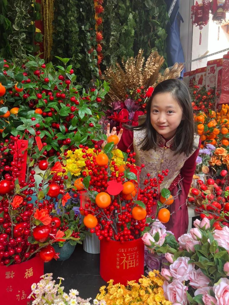 最惊喜的是摊位中央的巨型金元宝模型。它金灿灿的,刻着吉祥回纹,大得像个小板凳。我张开双臂抱住它,冰凉的表面泛着光,仿佛抱住了一座“福气山”,忍不住笑出了声。最后,我钻进一片热闹的年货花丛。最惹眼的是红彤彤的冬青果,一串串挨在一起,像挂满了小红灯笼,底下衬着深绿色的叶子,别提多喜庆了!旁边的金桔圆滚滚的,像一个个小金球,玫瑰红嘟嘟的,挤在一起像把春天的热闹都揉进了年货摊。我踮起脚摸了摸冬青果,指尖沾着细碎的喜气,忽然明白,年味不只是红纸灯笼,更是人潮里的烟火气,是人们脸上藏不住的笑意,是心里对新年的美好期盼。