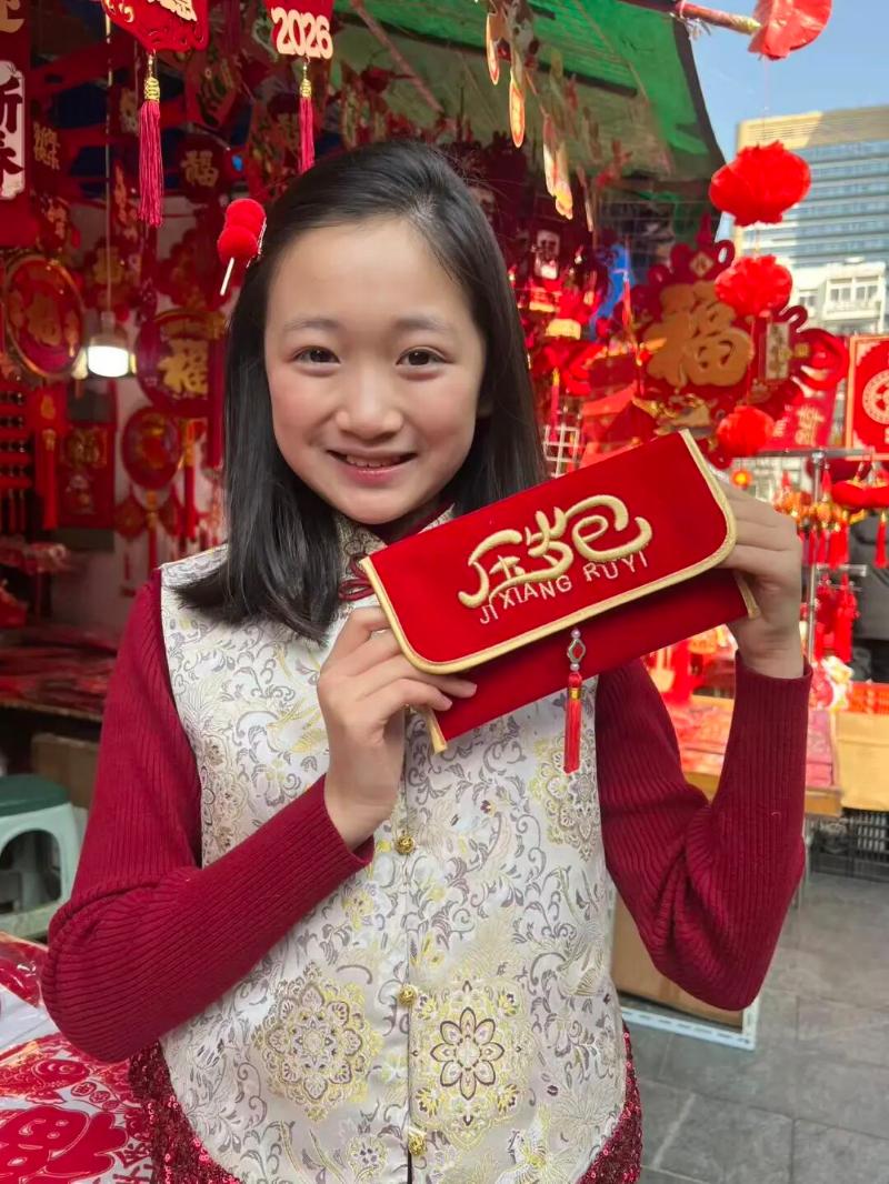 我先被窗花摊吸引住了。红色剪纸上,小马驮着“福”字撒欢,镂空花纹里藏着梅花纹。我举着窗花对着太阳晃,光影在身上跳舞,仿佛把新年福气披在了肩头。转身时,一个丝绒红包袋又勾住了我的脚步,它红得像个熟透的樱桃,“压岁”二字嵌着金边,摸起来软乎乎的。我把它贴在脸颊蹭了蹭,好像已经触到长辈塞压岁钱时温热的掌心,耳边仿佛响起了他们“岁岁平安”的叮嘱,心里暖暖的。