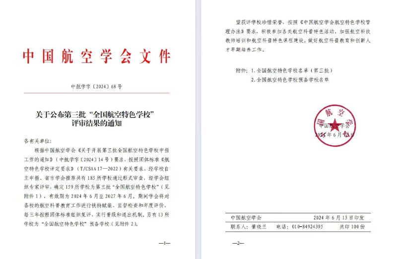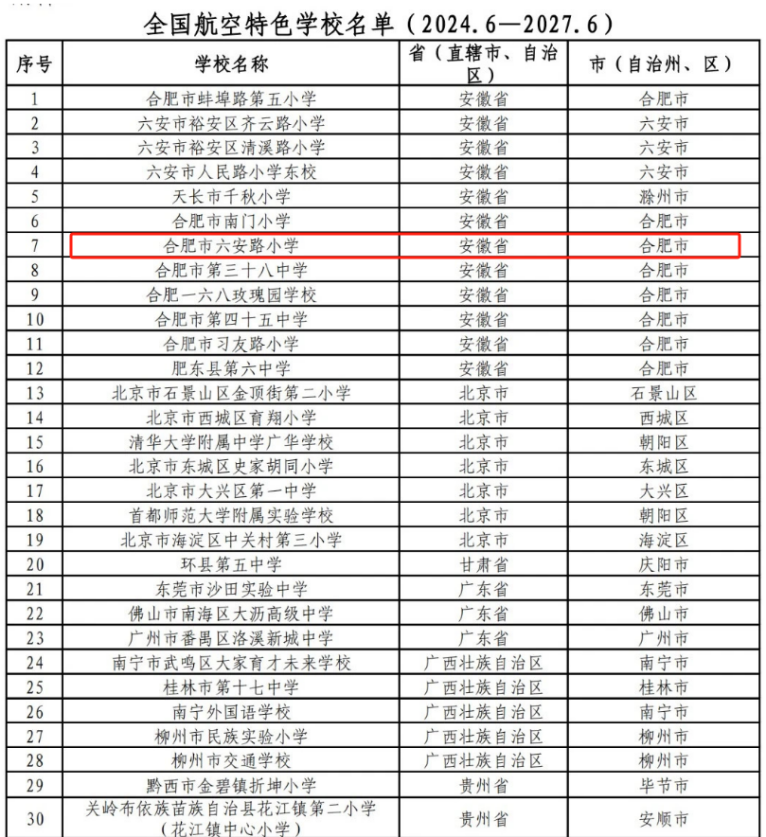 近日,中国航空学会下发《关于公布第三批“全国航空特色学校”评审结果的通知》。合肥市六安路小学喜获“全国航空特色学校”荣誉称号,标志着学校在航空特色教育发展领域迈上新台阶。