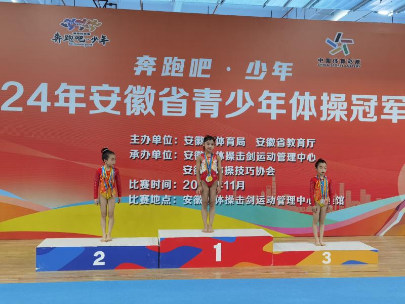 学校三(7)班王思妍在“奔跑吧·少年”2024年安徽省青少年体操冠军赛中,凭借卓越表现、精湛技艺和顽强拼搏精神,成功斩获省女子8岁组全能、自由体操和高低杠三项冠军,并荣获跳马项目亚军!在体操之路上,她不断挑战自己的极限,克服一个又一个困难,怀揣梦想勇往直前。