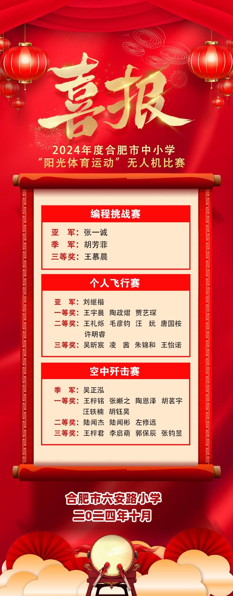 在2024年度合肥市“阳光体育运动”无人机赛项中,学校社团的团员们踊跃参赛,最终荣获一等奖13人、二等奖8人、三等奖9人的佳绩。其中,张一诚、胡芳菲分别夺得编程挑战赛亚军和季军,刘继楷斩获个人飞行赛亚军,吴正泓获得空中歼击赛季军的好成绩。备赛中,参赛团队积极参训,一遍遍试飞、模拟,夯实专业技能,以高标准要求自己,全心投入比赛。