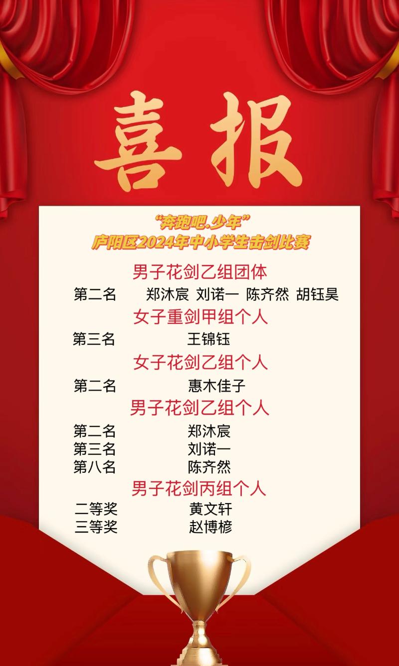 学校击剑小勇士身着帅气击剑服,手持闪亮剑刃,亮相2024年区中小学生击剑比赛现场。他们在攻防转换间展现速度与策略的完美结合,经过激烈角逐,最终荣获小学男子花剑乙组团体第二名,个人斩获第二名2人、第三名2人、第八名1人、二等奖1人和三等奖1人的好成绩。