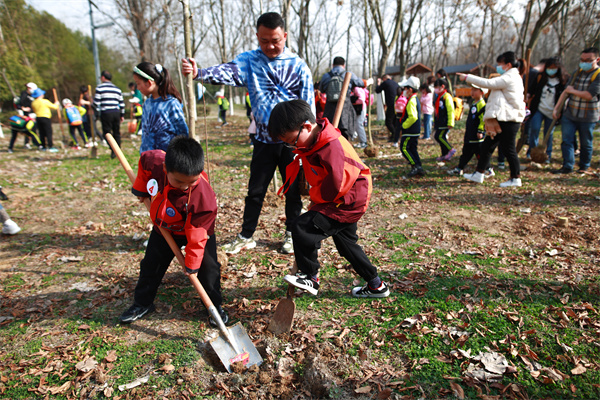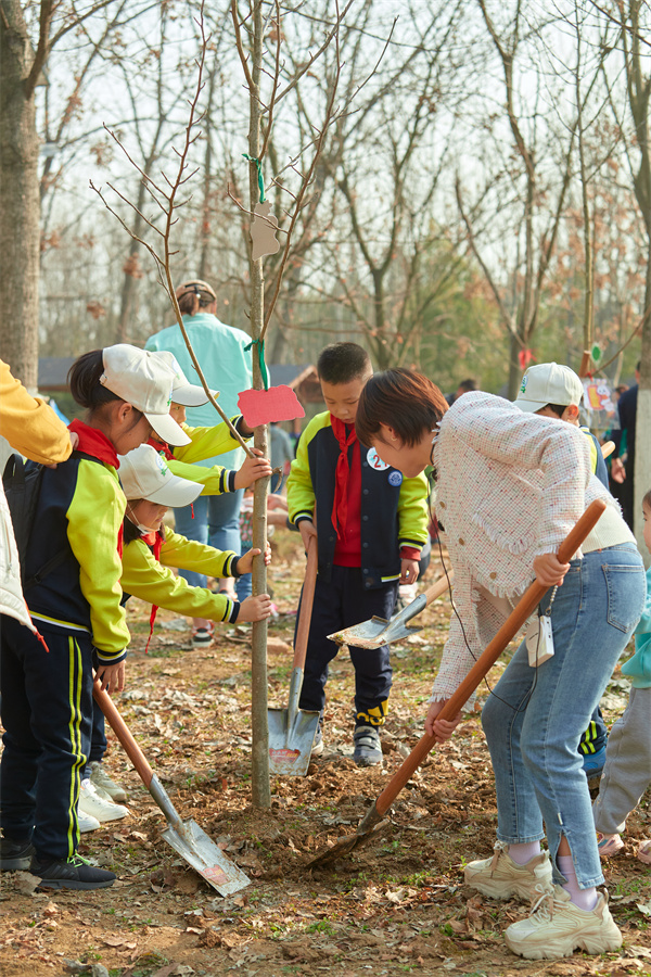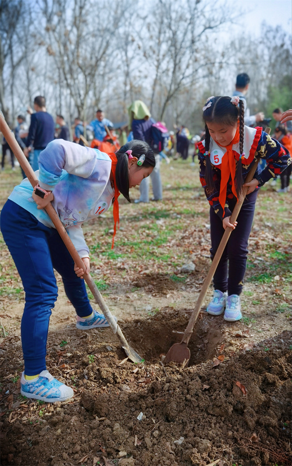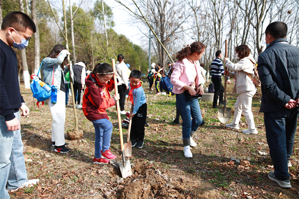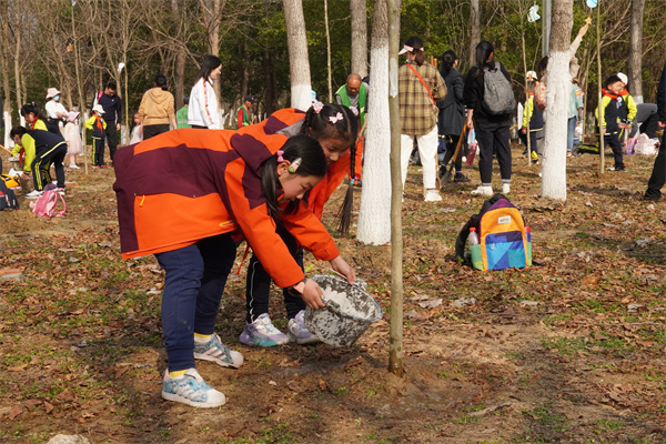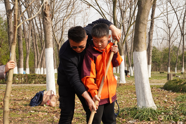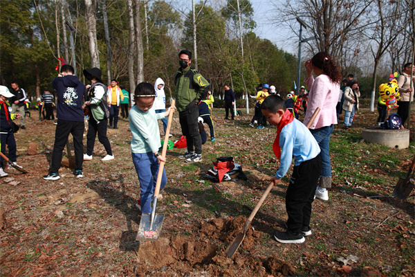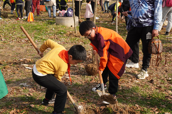 植树现场,大家热情洋溢,干劲十足,分工明确,配合默契。有的挥锹铲土,有的挖坑栽树,有的扶正苗木……到处都是忙碌的身影。经过不懈努力,一颗颗广玉兰树苗便挺立在沃土之上。