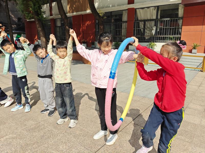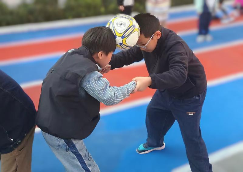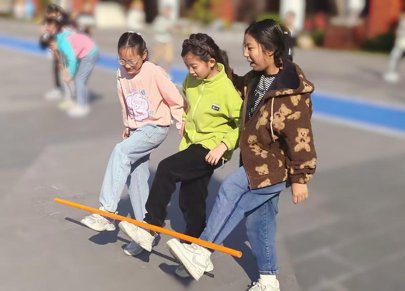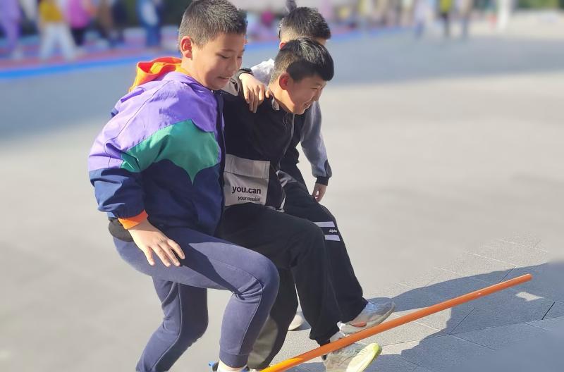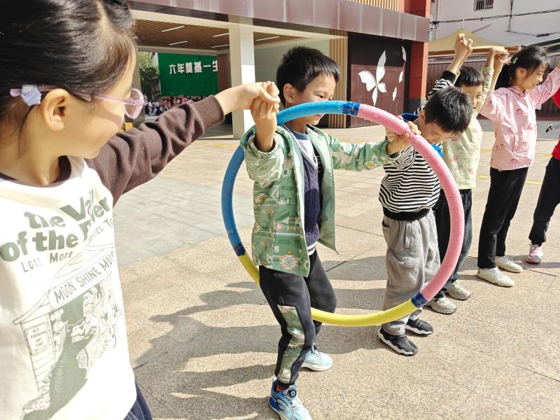 一、二年级的学生进行了“背靠背站起”和“呼啦圈传递”游戏,三至五年级学生开展了“双人夹球”“三人搭桥过河”等游戏,每一个看似简单的动作,都蕴含了合作与互助的深刻意义,学生们在一次次尝试中获得成功,进而感受互帮互助,共同进步的道理。