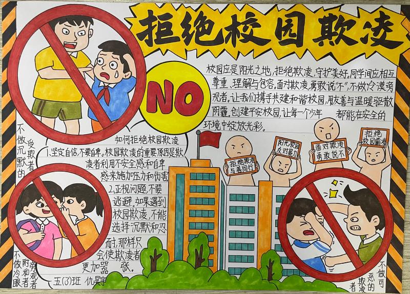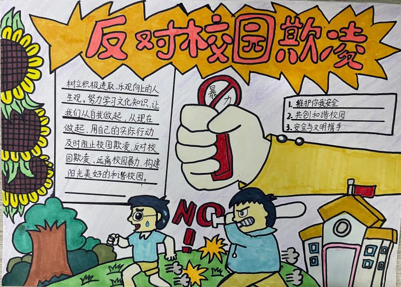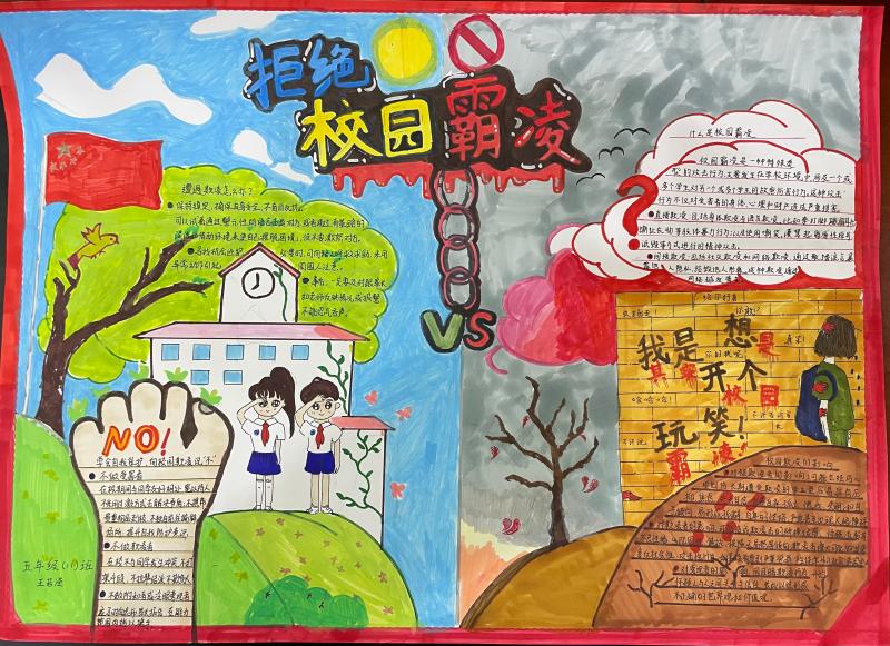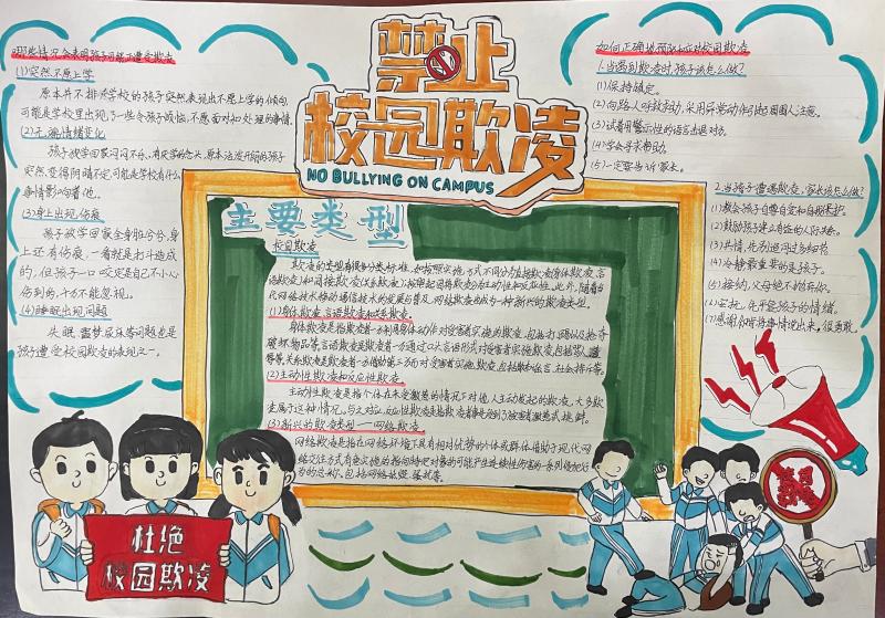 在主题教育活动后,各班学生精心设计并制作了有关校园防欺凌的宣传画。这些作品色彩斑斓,内容丰富,不仅包含了校园欺凌的定义、表现形式和预防措施,还融入了学生们对于和谐校园生活的美好愿景。学生们通过宣传画的形式向全校师生传递了反对校园欺凌的强烈信号,有效地提升了全校师生对校园欺凌问题的关注度和防范意识。