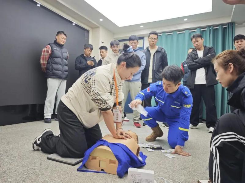 随着培训深入,林俊炜队长转入实操教学环节。他借助专业模拟人教具,将复杂的急救流程拆解为清晰步骤:从CPR的“判断意识、呼叫支援、胸外按压、开放气道、人工呼吸”五步核心操作,到AED的“开机启动、粘贴电极片、心律自动分析、实施除颤”全流程,每一个动作都细致讲解、标准示范。针对容易出错的细节,他更是重点强调:胸外按压需保持5-6厘米的深度、100-120次/分钟的频率,人工呼吸时要确保口腔密封不漏气,使用AED时必须确认周围无人员接触患者……通过精准点拨,帮助参训人员牢牢掌握操作关键。