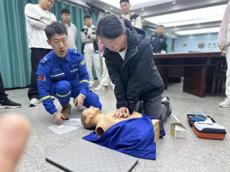 互动实操阶段,现场学习氛围愈发浓厚。体育教师们主动请缨、踊跃参与,在林俊炜队长及救援队队员的一对一指导下分组演练,反复调整按压力度与呼吸配合节奏,哪怕是手势角度、按压位置等细微偏差,都能得到即时纠正;校园保安们则全程专注投入,一边认真记录操作要点,一边主动提出疑问,不放过任何一个学习细节,高效吸收急救知识与技能。