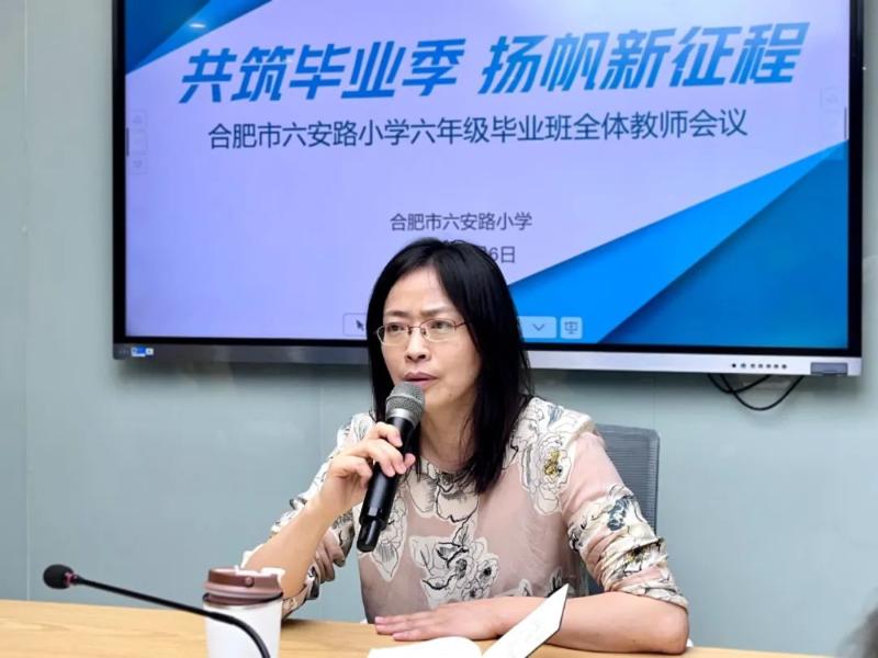 合肥市六安路小学教育集团党总支副书记、总校长朱清萍对毕业班工作进行总结及要求。她指出,六年奠基一生,习惯造就未来!六年级是学生人生成长的关键节点,老师们需进一步提振精神,加强学习,立足岗位,深耕课堂 。强化责任意识,优化教学方法,关心爱护学生,特别关注学生个体差异及心理变化,以父母之心、师者之爱,为孩子们的小学学习生活画上温暖句号,为未来成长注入持久动力!