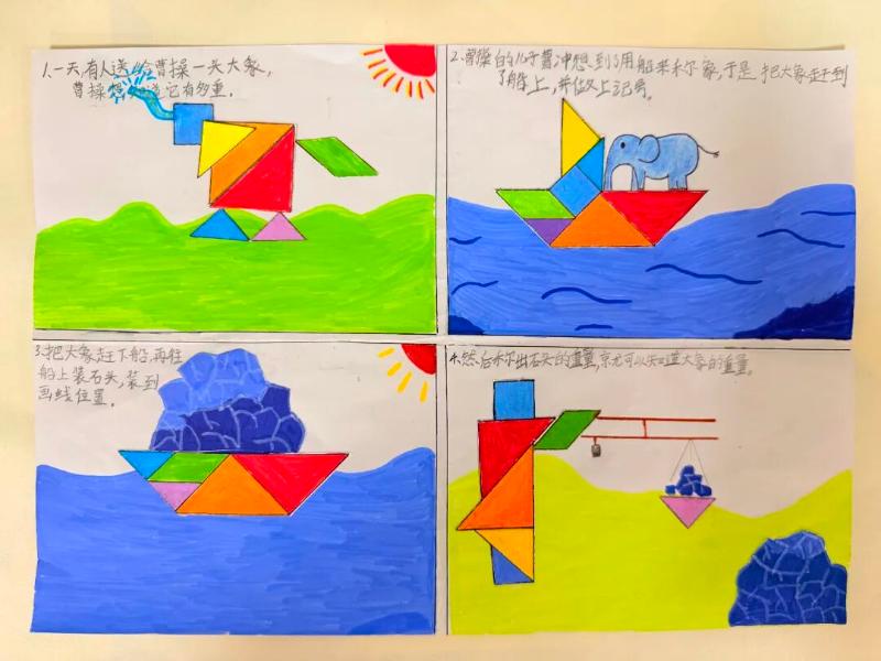 三、四年级“巧手拼出小故事”创意实践显能力三、四年级的活动设计更具综合性和挑战性,学生们需要运用多组七巧板,通过连续拼接出的不同场景或角色,来构思并讲述一个完整的小故事,如“守株待兔”“小猫钓鱼”“龟兔赛跑”等。活动不仅考察了学生的实践能力,更将数学逻辑、空间想象与语言表达相结合,是跨学科融合的一次有益尝试,有效提升了学生的核心素养。
