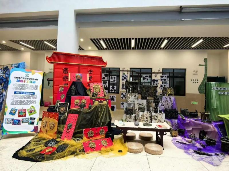在庐阳区“YUE动庐阳 欢乐校园”学生素养展示暨少年宫社团展演上,手工创意社团以“青铜古韵”为主题进行展示。同学们认真挑选材料,精心设计造型,让青铜器从泥土中“重生”,经过千锤百炼,最终成为璀璨的艺术瑰宝。辅首衔环表面所刻纹饰线条流畅,图案神秘,展现了手工制品独特的魅力。