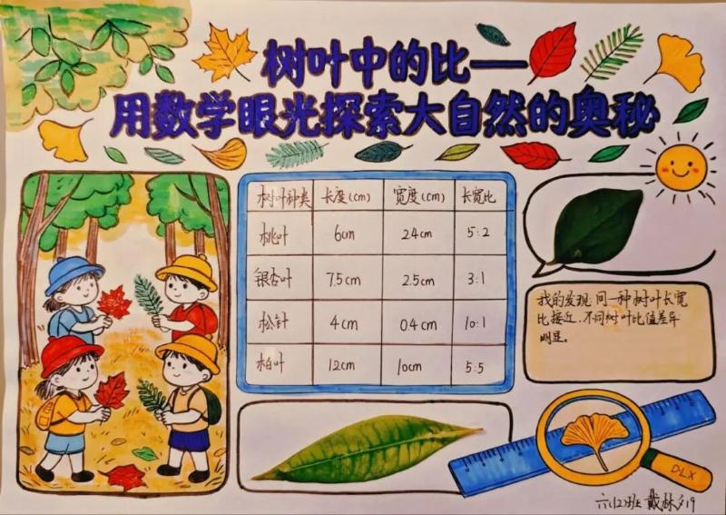 六年级数学组开展了以“树叶中的比”为主题的特色实践活动。学生们化身“自然侦探”与“数学观察家”,亲身体验如何用理性的数学工具解读大自然中蕴含的感性之美。数学不仅是抽象的数字与公式,更是大自然用以构建万千形态的“隐藏语言”。这次活动,连接起科学的“真”与自然的“美”,进一步激发了同学们深入思考与主动探索的兴趣。