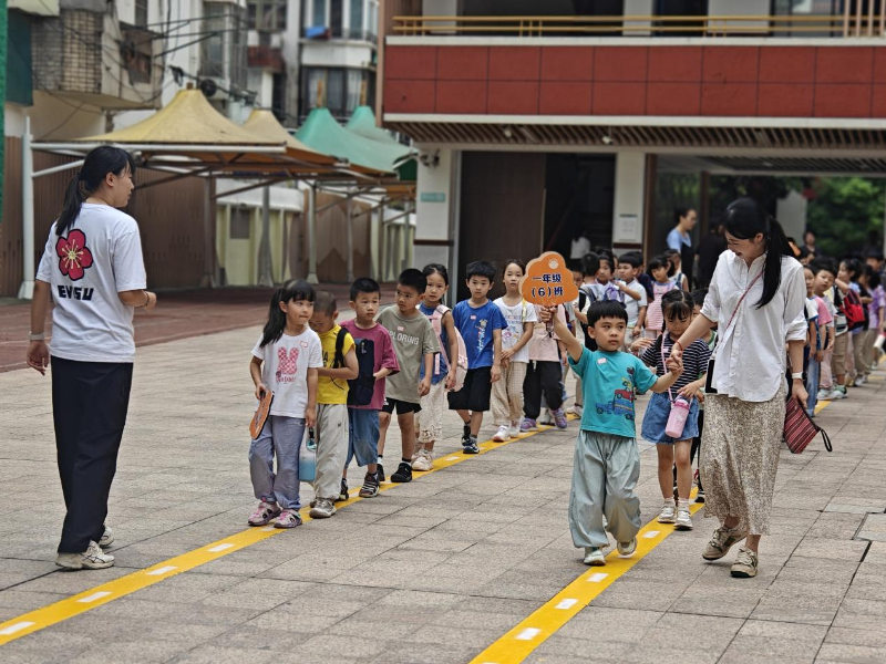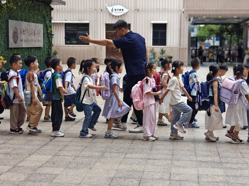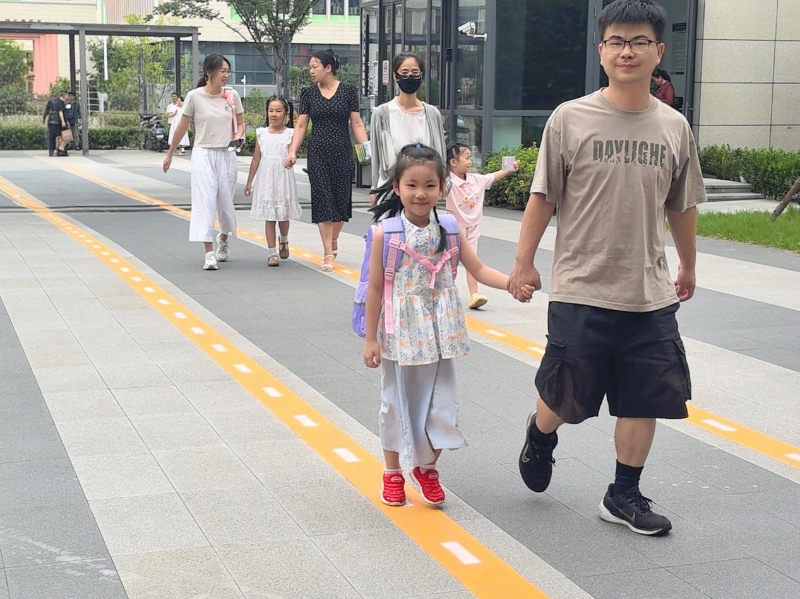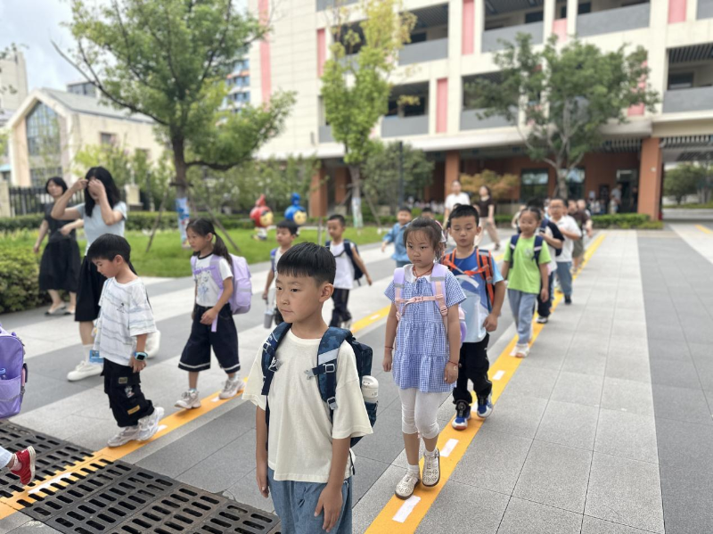 时间虽短,但不阻碍大家对新环境的探索。入学第一天,也是启蒙第一步。孩子们在老师的引导下,排成整齐路队,认识卫生间、活动区域、校园生活角落,井然有序的放学队伍就是孩子们骄人的练习成果。解锁新身份:新生家长