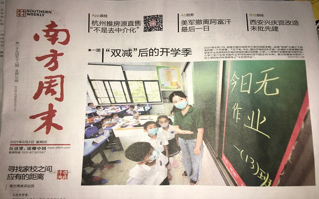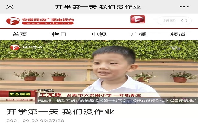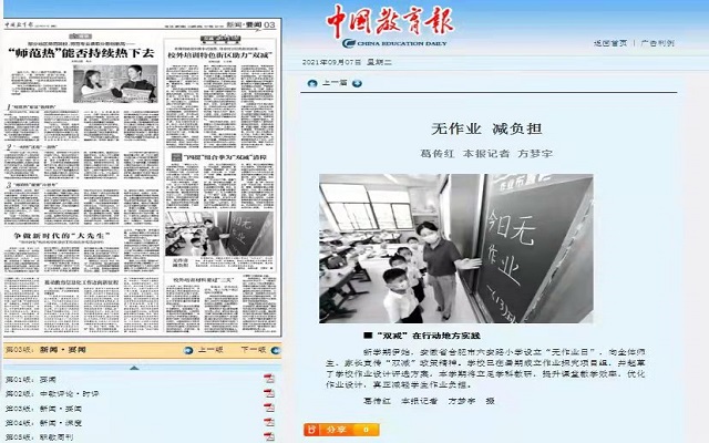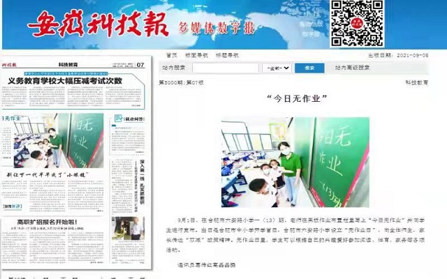 新学期伊始,安徽省合肥市六安路小学设立“无作业日”,向全体师生、家长宣传“双减”政策精神。学校已在暑期成立作业探究项目组,并起草了学校作业设计评选方案,本学期将立足学科教研,提升课堂教学效率,优化作业设计,真正减轻学生作业负担。《中国教育报》《南方周末》《合肥日报》等多家媒体对此活动进行报道,引起热烈反响。