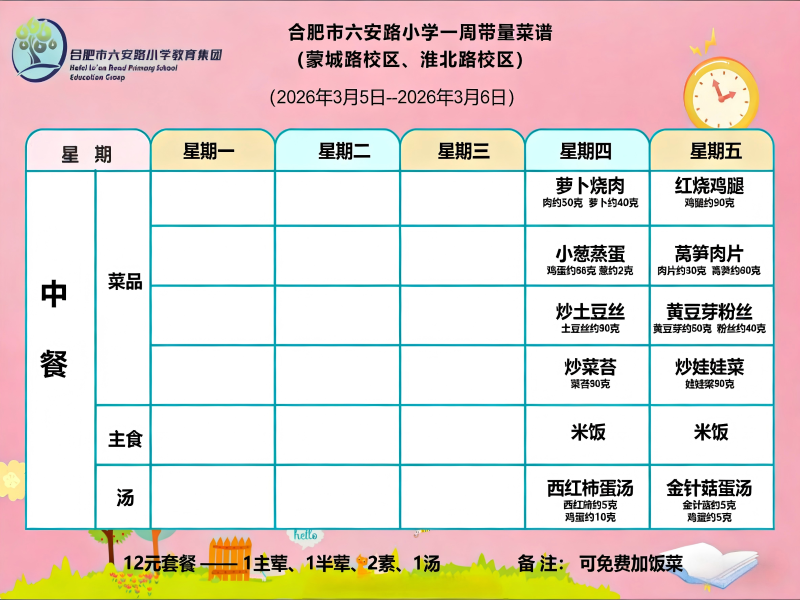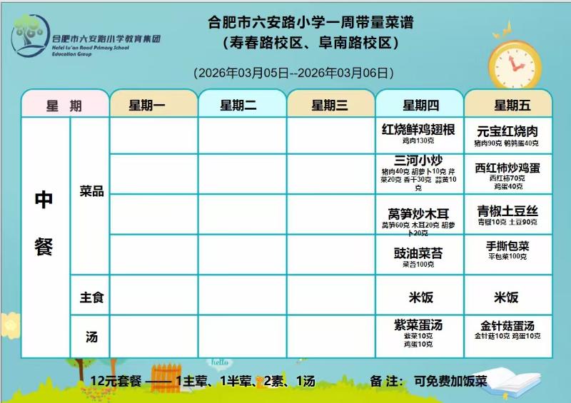 合肥市六安路小学教育集团一周带量菜谱(2026年3月5日--2026年3月6日)