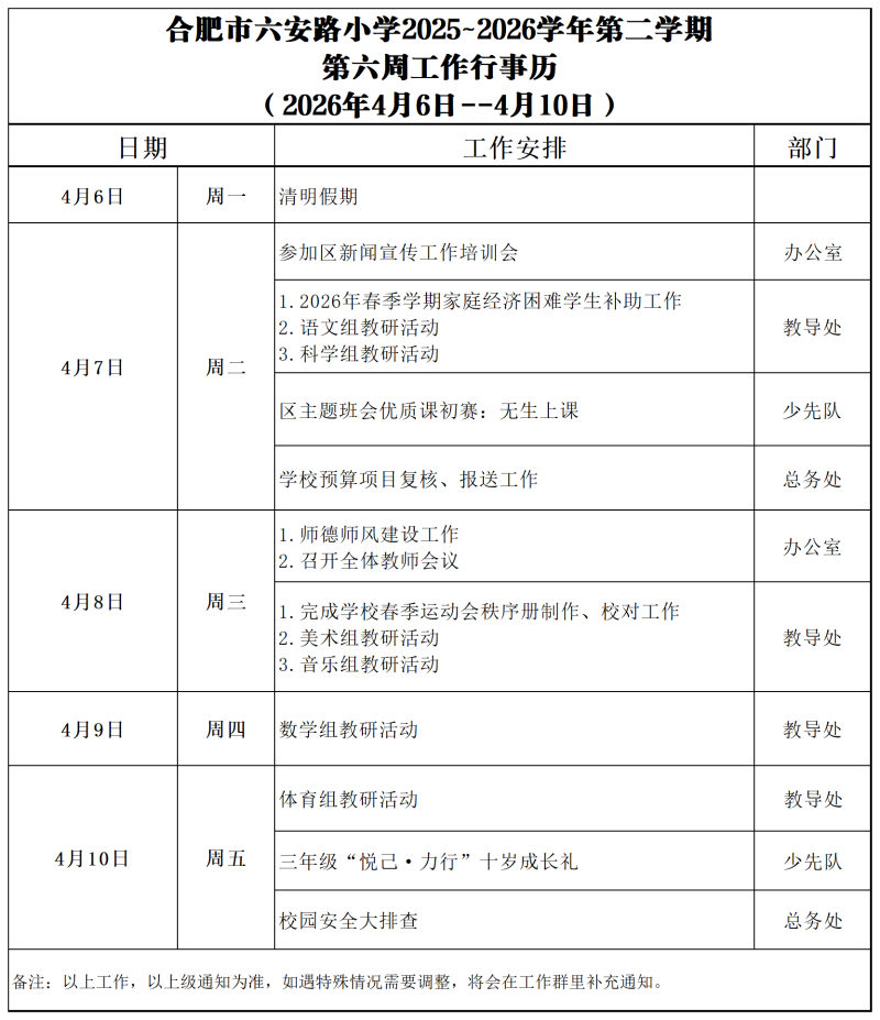 第六周:合肥市六安路小学教育集团2025-2026学年第二学期工作行事历